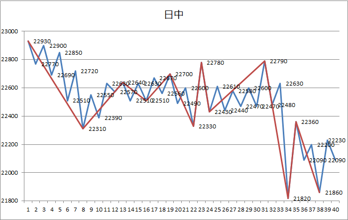仮に22860を寄ってから突破してきたとしてもすでにここまでの60分足の上昇波動における、時間、値幅、含まれる15分足の波動数・・・などを考えて、ここから更にドカンと上がるとはちょっと考えにくいんですよねえ。