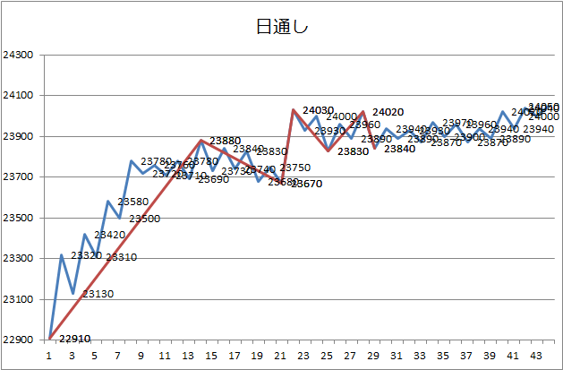 長い横ばいのゾーンから引けでなんとか10円だけ抜けて終了という状況。